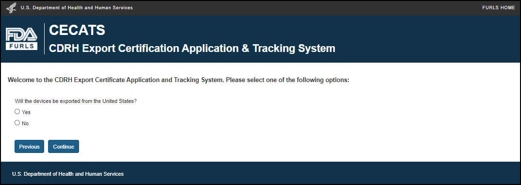 Log into the FDA Industry Systems (FIS) https://www.access.fda.gov and select "CDRH Export Certification Application and Tracking System" from the list of available systems on the FURLS "Home" page (Figure 1).