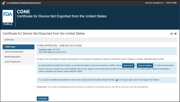 Select "No" in response to the question "Will the devices be exported from the United States?", as shown in Figure 2 below. Select "Continue" and the system will open the CDNE "Home" page. The CDNE Home page is shown in Figure 3 below.