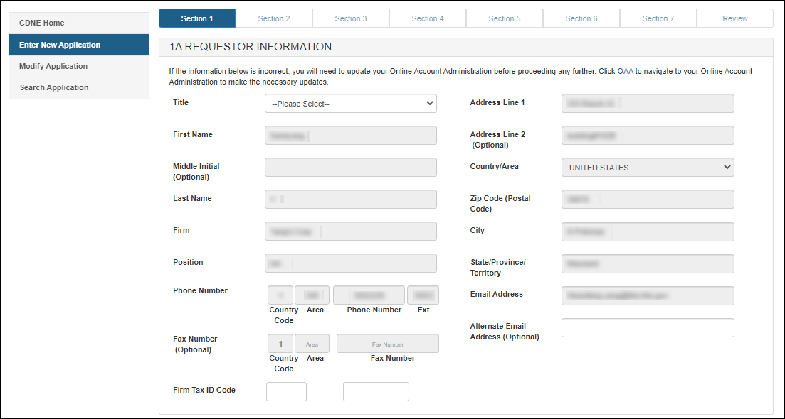 The system auto-populates specific information from your Online Account Administration (OAA) into Section 1A - Requestor Information, as shown below in Figure 8.