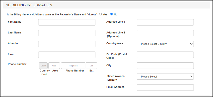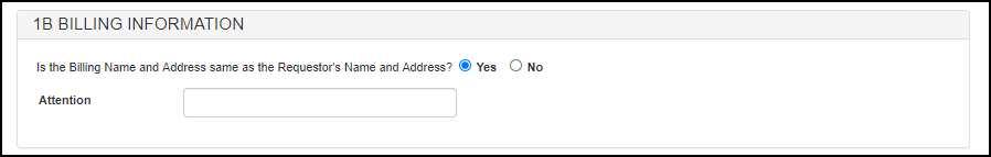In section 1B: "Is the Billing Name and Address same as the Requestor's Name and Address?" If you select "Yes", you have the option to enter an alternate addressee in the "Attention" field, (Figure 9). If you select "No", you may enter an alternate billing address in the fields provided, (Figure 10).