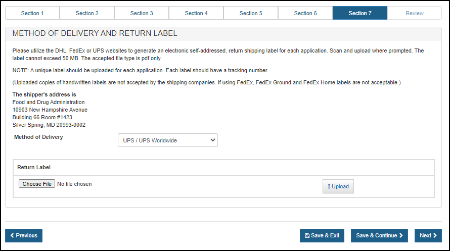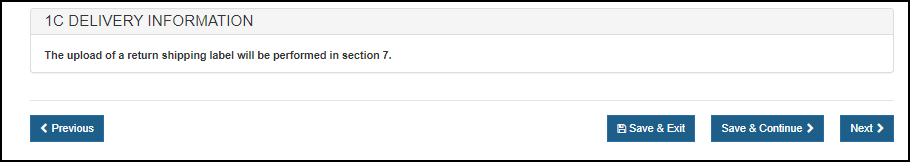 Per Section 1C: "Delivery Information" The upload of a return shipping label will be performed in Section 7, (Figure 11).