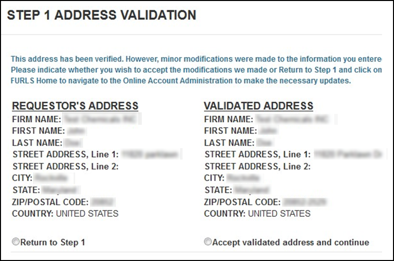 On the "Address Validation" screen, please click "Accept validated address and continue" to indicate that you (the requestor) are still located at the address identified (Figure 12). Later, you will identify the manufacturing facility's address.