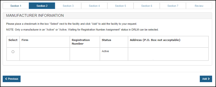 As long as the OON is active, all facilities associated with the OON will be displayed. Select one facility from the list of manufacturers that are in active status (Figure 14). Inactive facilities will be grayed out and cannot be selected.