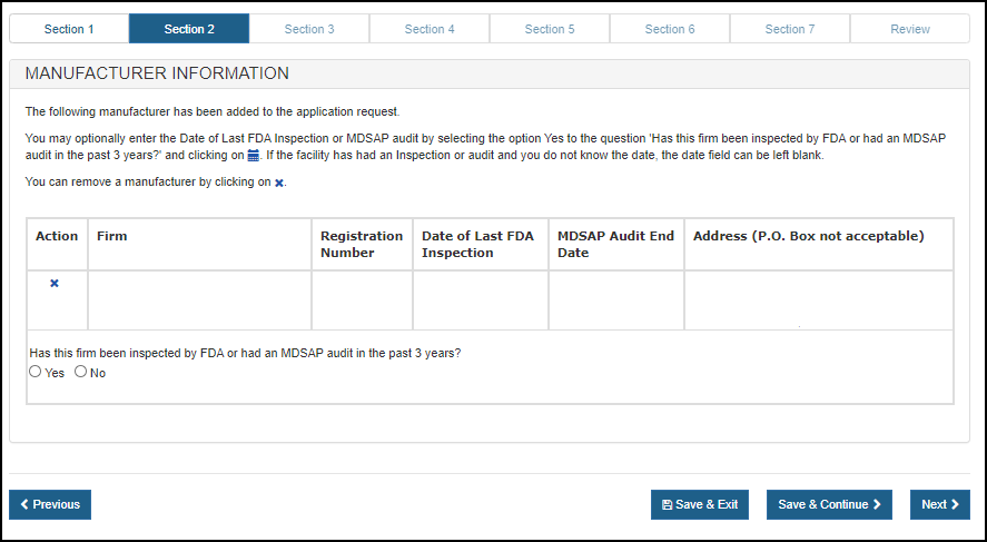 Select the radio button in response to the question "Has this firm been inspected by FDA or had an MDSAP audit in the past 3 years?"