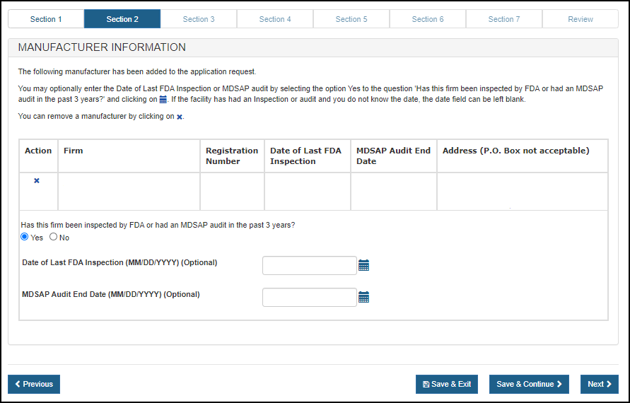 Optional: If you select "Yes" for the question "Has this firm been inspected by FDA or had an MDSAP audit in the past 3 years?", you may enter the "Date of Last FDA inspection" or the "MDSAP Audit End Date" (Figure 16).