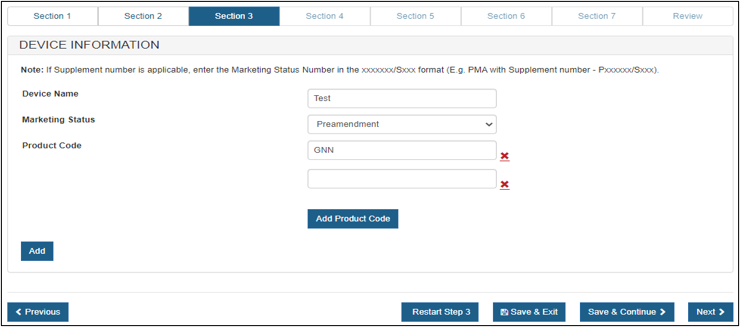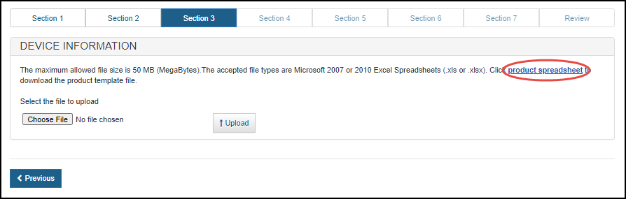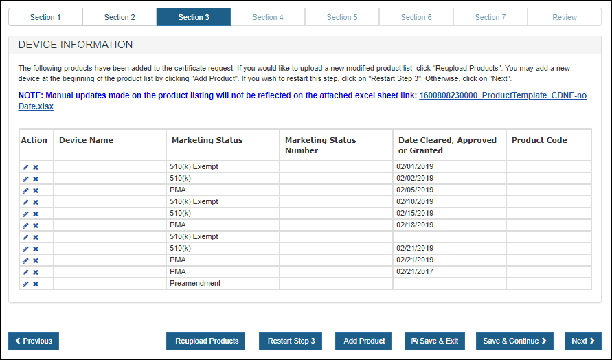 For PMA, 510(k), De Novo, and HDE authorizations, enter the following additional information: For 510(k), Enforcement Discretion, and Preamendment authorizations, enter the Product Code. Click the “Add Product Code” button to enter multiple Product Codes. Once all the information has been added, click “Add” to add the device (Figure 18). Figure 18: Manually Add Devices Continue to add additional devices in the same manner as above. When finished, click "Next". To Upload Your Device Names: Click "product spreadsheet" hyperlink (Figure 19) to download a template
