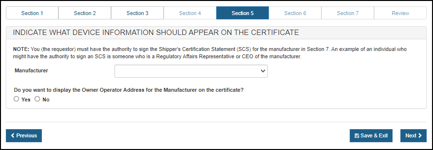 NOTE: If the owner operator name or address is incorrect, return to Section 2. Delete the manufacturer and re-enter the application in CDNE. This will pull any updated information from FURLS/DRLM.