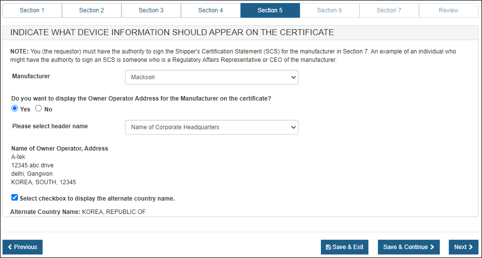 The facility to be printed on the certificate: The foreign manufacturer entered in section 2 will appear (Figure 24) and must appear on the certificate. The "Name of Manufacturer" header will appear above the facility’s name and address.