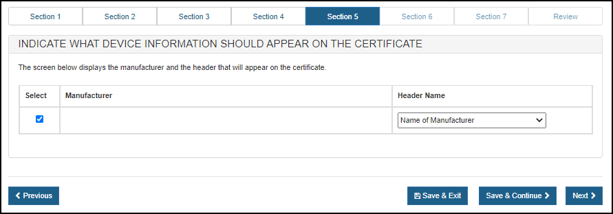 The manufacturer will appear on the certificate(s) under the header "Name of Manufacturer" (Figure 22).