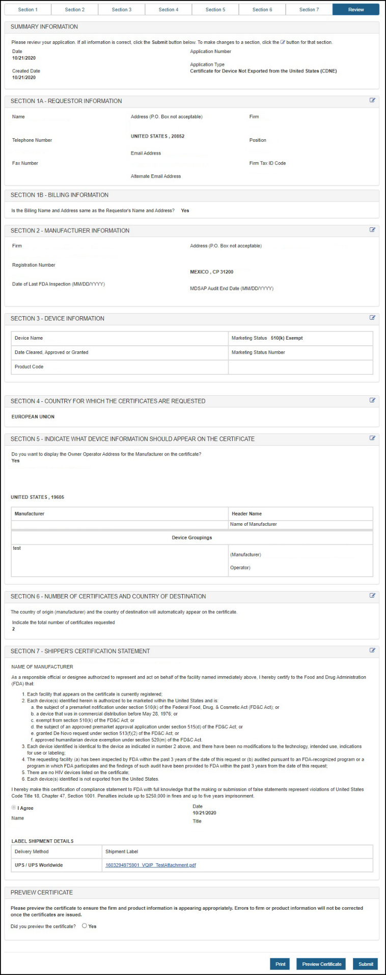 NOTE: "Return for Action" status indicates that upon review of the application by FDA, additional information or clarification was required. An email will be sent to the requestor with comments from the reviewer; there will then be a 48-hour window for any modifications. If modifications cannot be made within 48 hours the status will automatically change to "Incomplete". An application in "Incomplete" status may be cloned when you are ready to modify and submit it. A new application number will be assigned. No charges are incurred for an application unless certificates are issued.