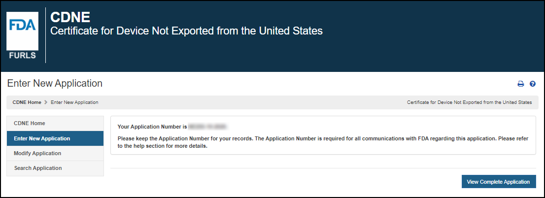 "Save & Continue" – Information entered up to this point will be saved in "Draft" status. An application number will be assigned when you click on the "Save & Continue" button the first time. This number will be visible on the top of the screen until the application is submitted. Please keep the application number for your records as well as any communication with FDA regarding this application. Your application will be set to "Draft" status until you complete and submit the application. If you do not perform any activity for 30 days, the system will automatically change the status to "Not Submitted" and may delete the application.