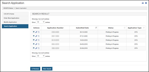 To search for an application, click "Search Application" menu option from the CECATS or CFG-NE "Home" page, as shown in Figure 4.