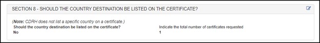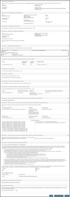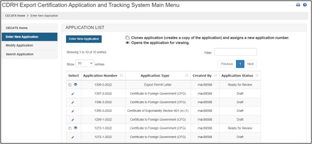 icon If the application is in Return for Action status, after selecting the Edit icon To clone the application, select the Clone (double book) icon The cloning feature allows a user to copy any submitted application. Once cloned, the user will have the ability to update any or all sections of the application prior to submission. NOTE: To clone an application: NOTE: If your list of applications becomes too large, the “Search” function is a viable option to quickly locate a specific application. You can also use Ctrl+F on using your keyboard to search for the application while on the “Enter New Application” screen. Before submitting the application, click "Preview Certificate" to ensure the firm and device information appears as desired. When your application is ready for submission, click "Submit". Once submitted, you will receive an email stating your application was successfully submitted. NOTE: Please save the application number for future reference. The application number will be required to check the status of your application. Figure 7: Enter New Application