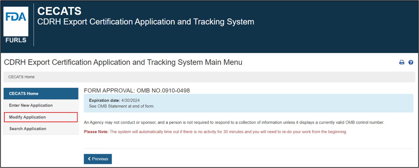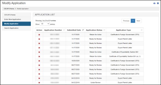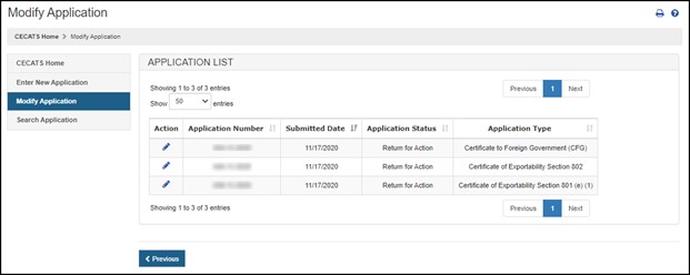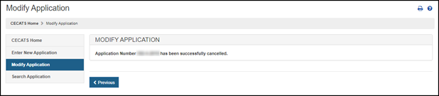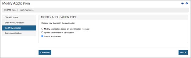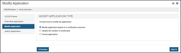 Select the "Modify Application" menu option from the CECATS or CFG-NE "Home" page, as shown in Figure 8. Figure 8: Modify Application