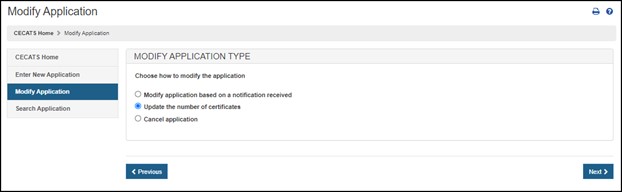 To change the number of certificates requested, select "Modify Application", and select "Update the number of certificates" option, as shown in Figure 12.