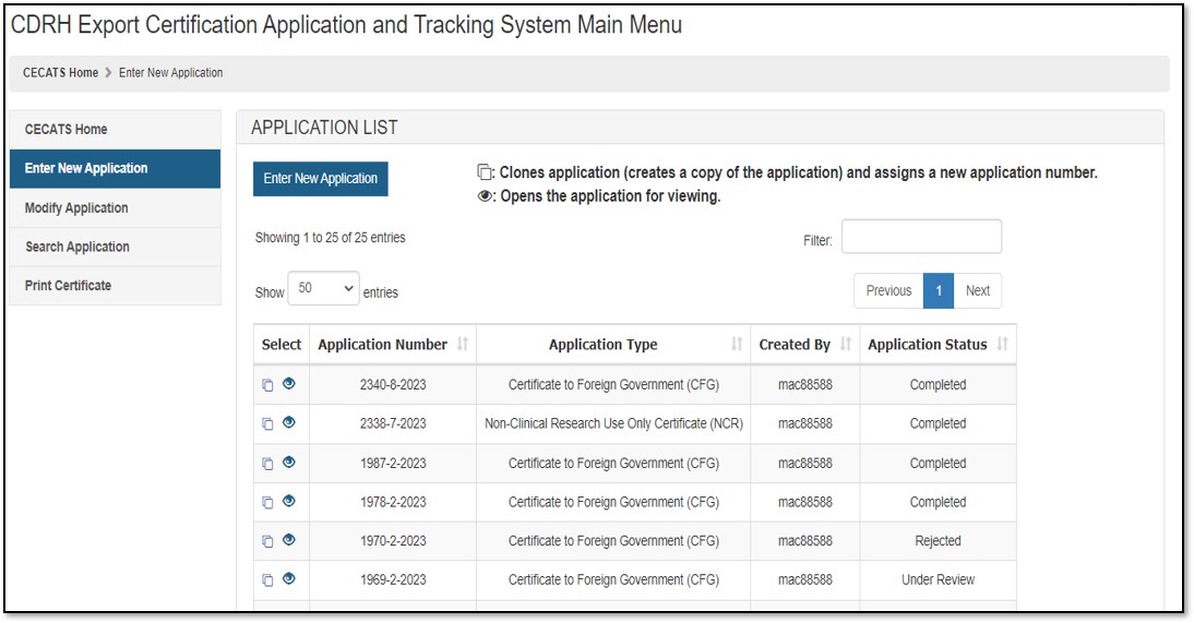 NOTE: "Return for Action" status indicates that upon review of the application by the FDA, additional information or clarification was required. CECATS will send an email to the requestor, with comments from the reviewer. They will provide a 48-hour window for modifications. If modifications cannot be made within 48 hours, the status will automatically change to "Incomplete". Please clone, modify, and submit the application when ready. A new application number will be assigned.