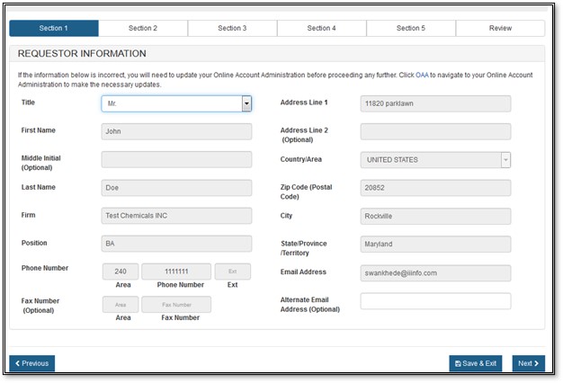 Most of the fields in section one is automatically populated based on the information from your Online Account Administration (OAA) and cannot be edited in CECATS. If the information is incorrect, you can click on the "FURLS Home" link, located in the top right corner. Then select "Edit Account Profile" on the left-hand side and update your account profile accordingly.