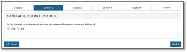 The manufacturing company is the company that manufactures one or more of the products. This company can be the same as the requestor. The system prompts whether your manufacturing name and address are the same as the requestor name and address, as shown in Figure 9 below.