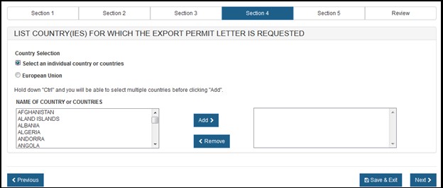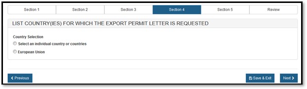 Foreign Liaison Information is required for all selected importing countries. Repeat the process for all importing countries you have selected in your EPL application. Click on "Next" to proceed.