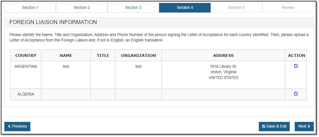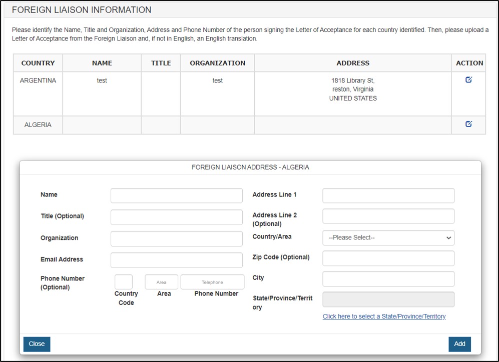 Identify the Name, Title, Email Address, Organization, Address(including zip code) and Phone Number of the person signing the Letter of Acceptance for each country identified. Click Add, you shall see the Foreign Liaison Information updated for the specific country. See Figure 16 below.