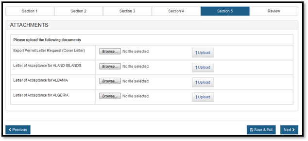 For an Export Permit Letter, you must provide the Export Permit Letter Request (Cover Letter) and the Letter of Acceptance for the specific country or the European Union, as shown in Figure 17 below.