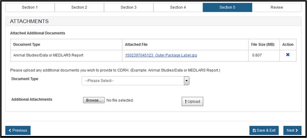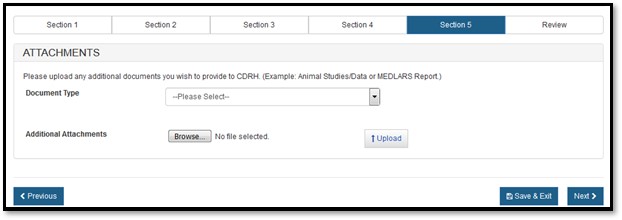 Use this section to upload any documents specifically requested by an FDA reviewer (e.g. MDSAP audit or FDA inspection record). See Figure 21 below.